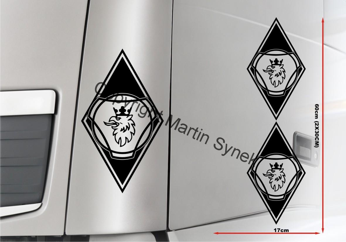 Sada samolepek na deflektor či zrcátku, kabinu, kamkoliv. Sada obsahuje vždy dvě samolepky na levou a pravou stranu. Klasická, řezaná samolepka. To znamená, že když například vyberete modrou samolepku, bude motiv modrý a vše mimo motiv i vně motivu bude mít barvu podkladu kam samolepku lepíte.