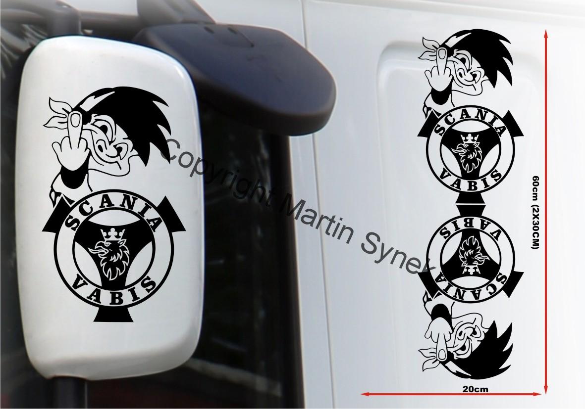 Sada samolepek na deflektor či zrcátku, kabinu, kamkoliv. Sada obsahuje vždy dvě samolepky na levou a pravou stranu. Klasická, řezaná samolepka. To znamená, že když například vyberete modrou samolepku, bude motiv modrý a vše mimo motiv i vně motivu bude mít barvu podkladu kam samolepku lepíte.