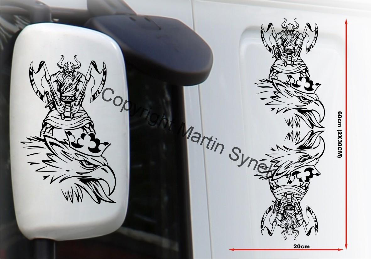 Sada samolepek na deflektor či zrcátku, kabinu, kamkoliv. Sada obsahuje vždy dvě samolepky na levou a pravou stranu. Klasická, řezaná samolepka. To znamená, že když například vyberete modrou samolepku, bude motiv modrý a vše mimo motiv i vně motivu bude mít barvu podkladu kam samolepku lepíte.