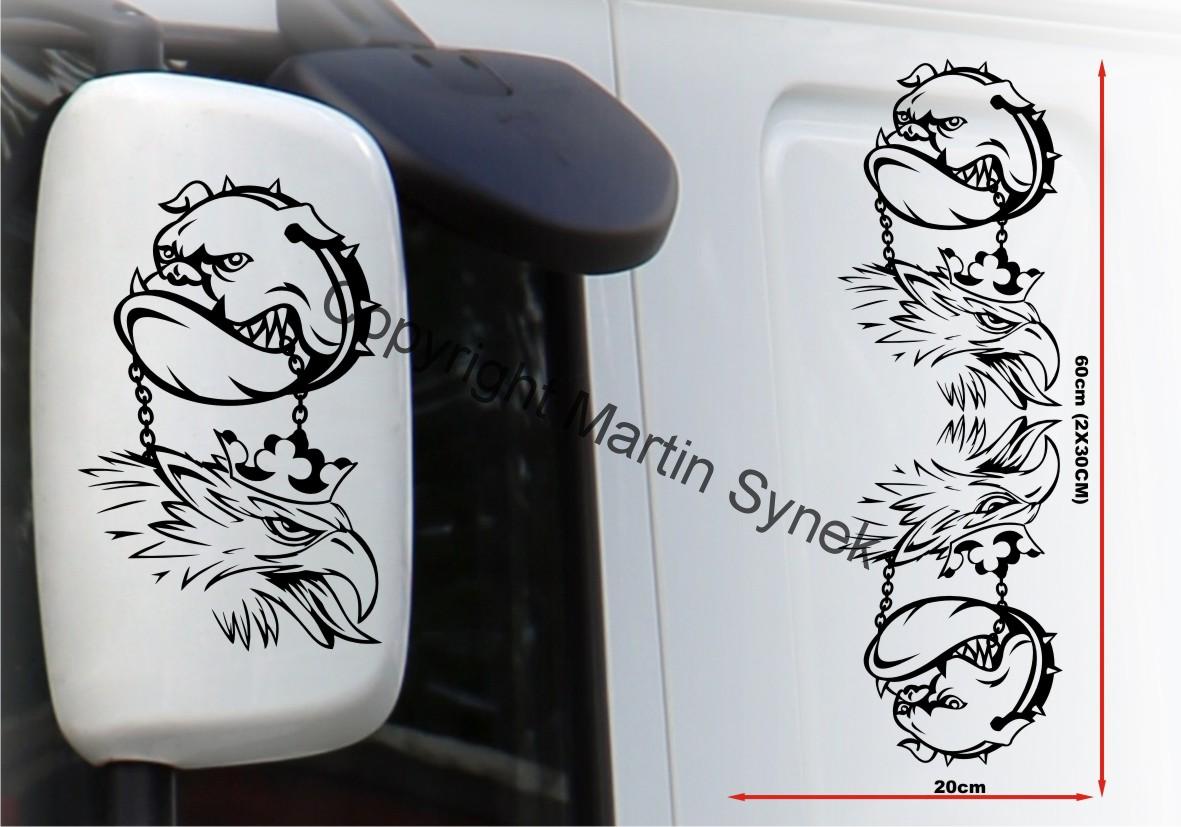 Sada samolepek na deflektor či zrcátku, kabinu, kamkoliv. Sada obsahuje vždy dvě samolepky na levou a pravou stranu. Klasická, řezaná samolepka. To znamená, že když například vyberete modrou samolepku, bude motiv modrý a vše mimo motiv i vně motivu bude mít barvu podkladu kam samolepku lepíte.