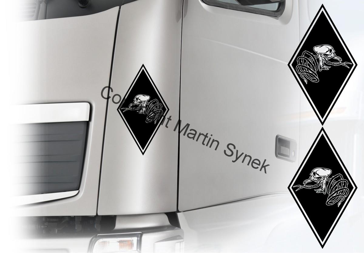 Sada samolepek na deflektor či zrcátku, kabinu, kamkoliv. Sada obsahuje vždy dvě samolepky na levou a pravou stranu. Klasická, řezaná samolepka. To znamená, že když například vyberete modrou samolepku, bude motiv modrý a vše mimo motiv i vně motivu bude mít barvu podkladu kam samolepku lepíte.