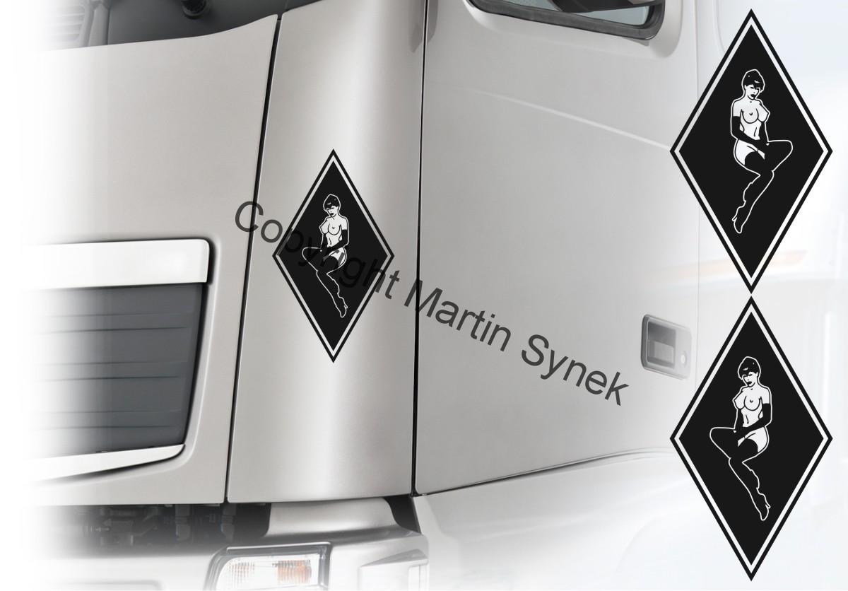 Sada samolepek na deflektor či zrcátku, kabinu, kamkoliv. Sada obsahuje vždy dvě samolepky na levou a pravou stranu. Klasická, řezaná samolepka. To znamená, že když například vyberete modrou samolepku, bude motiv modrý a vše mimo motiv i vně motivu bude mít barvu podkladu kam samolepku lepíte.