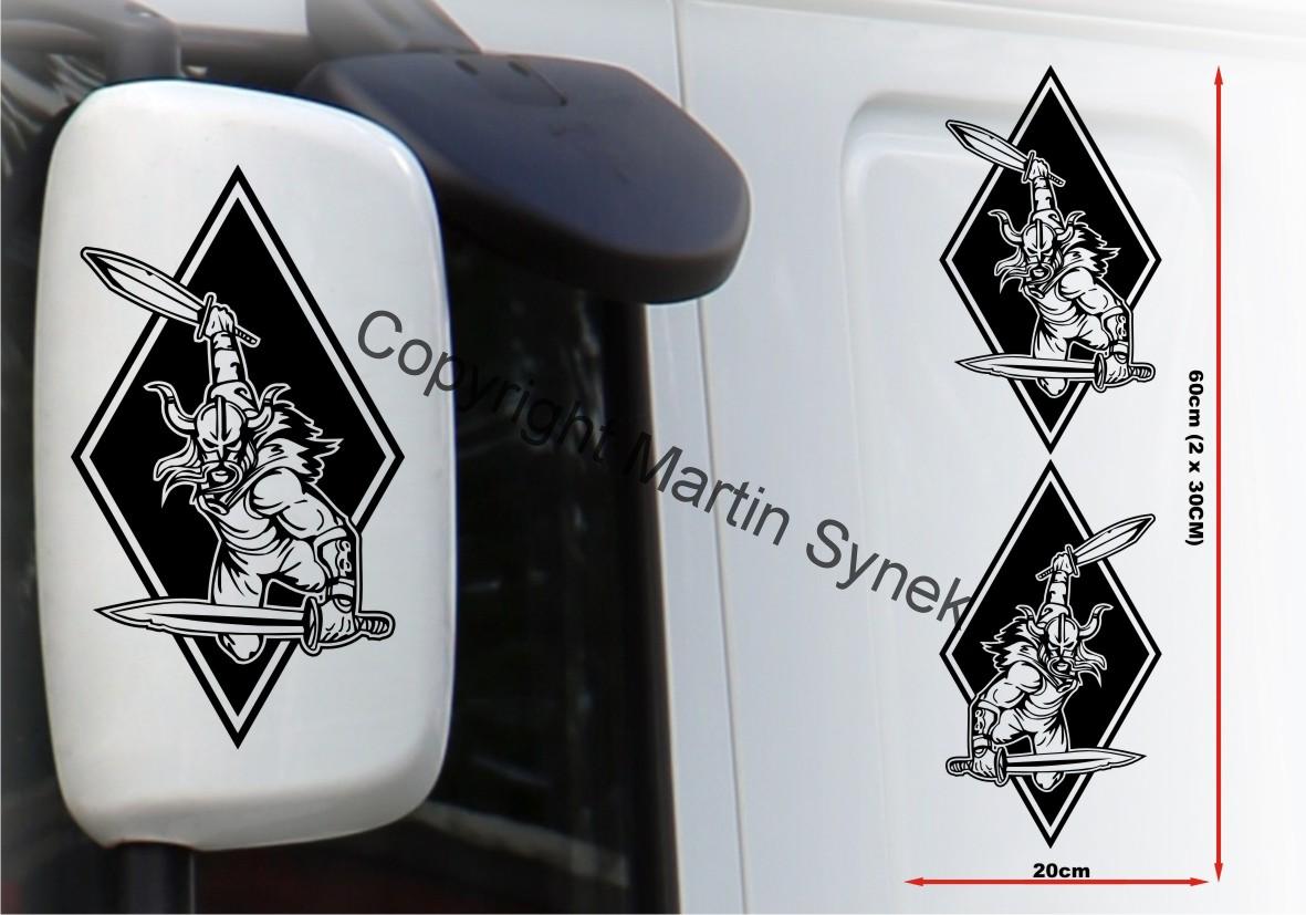 Sada samolepek na deflektor či zrcátku, kabinu, kamkoliv. Sada obsahuje vždy dvě samolepky na levou a pravou stranu. Klasická, řezaná samolepka. To znamená, že když například vyberete modrou samolepku, bude motiv modrý a vše mimo motiv i vně motivu bude mít barvu podkladu kam samolepku lepíte.