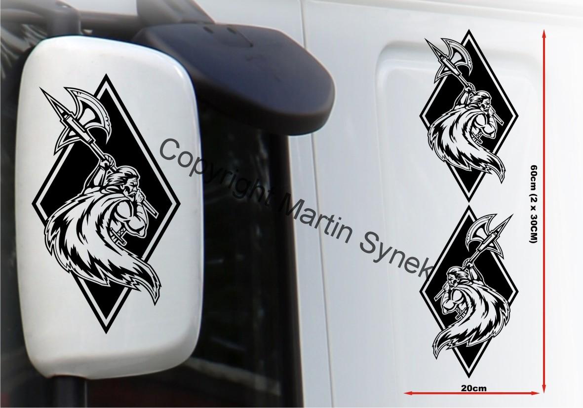 Sada samolepek na deflektor či zrcátku, kabinu, kamkoliv. Sada obsahuje vždy dvě samolepky na levou a pravou stranu. Klasická, řezaná samolepka. To znamená, že když například vyberete modrou samolepku, bude motiv modrý a vše mimo motiv i vně motivu bude mít barvu podkladu kam samolepku lepíte.