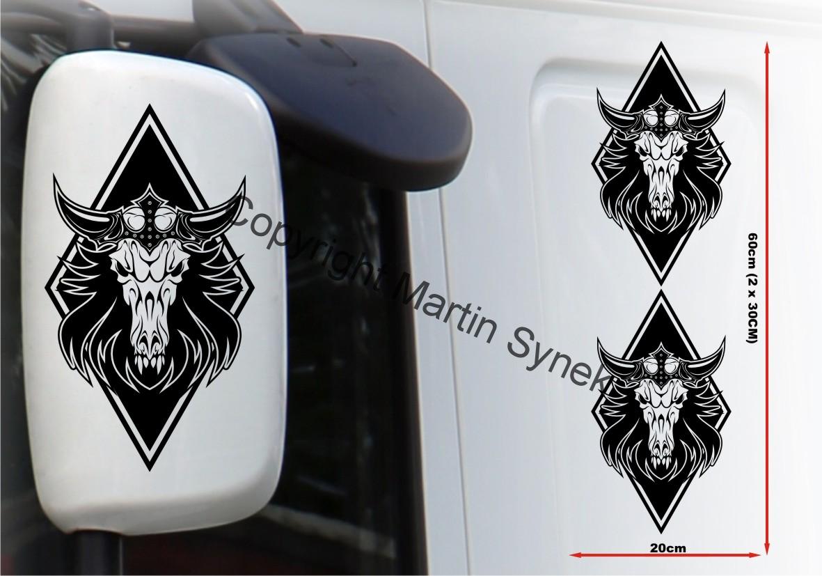 Sada samolepek na deflektor či zrcátku, kabinu, kamkoliv. Sada obsahuje vždy dvě samolepky na levou a pravou stranu. Klasická, řezaná samolepka. To znamená, že když například vyberete modrou samolepku, bude motiv modrý a vše mimo motiv i vně motivu bude mít barvu podkladu kam samolepku lepíte.
