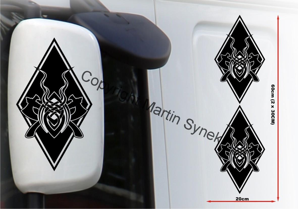 Sada samolepek na deflektor či zrcátku, kabinu, kamkoliv. Sada obsahuje vždy dvě samolepky na levou a pravou stranu. Klasická, řezaná samolepka. To znamená, že když například vyberete modrou samolepku, bude motiv modrý a vše mimo motiv i vně motivu bude mít barvu podkladu kam samolepku lepíte.