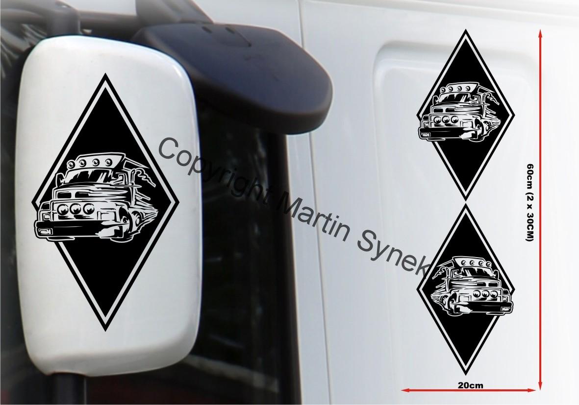 Sada samolepek na deflektor či zrcátku, kabinu, kamkoliv. Sada obsahuje vždy dvě samolepky na levou a pravou stranu. Klasická, řezaná samolepka. To znamená, že když například vyberete modrou samolepku, bude motiv modrý a vše mimo motiv i vně motivu bude mít barvu podkladu kam samolepku lepíte.