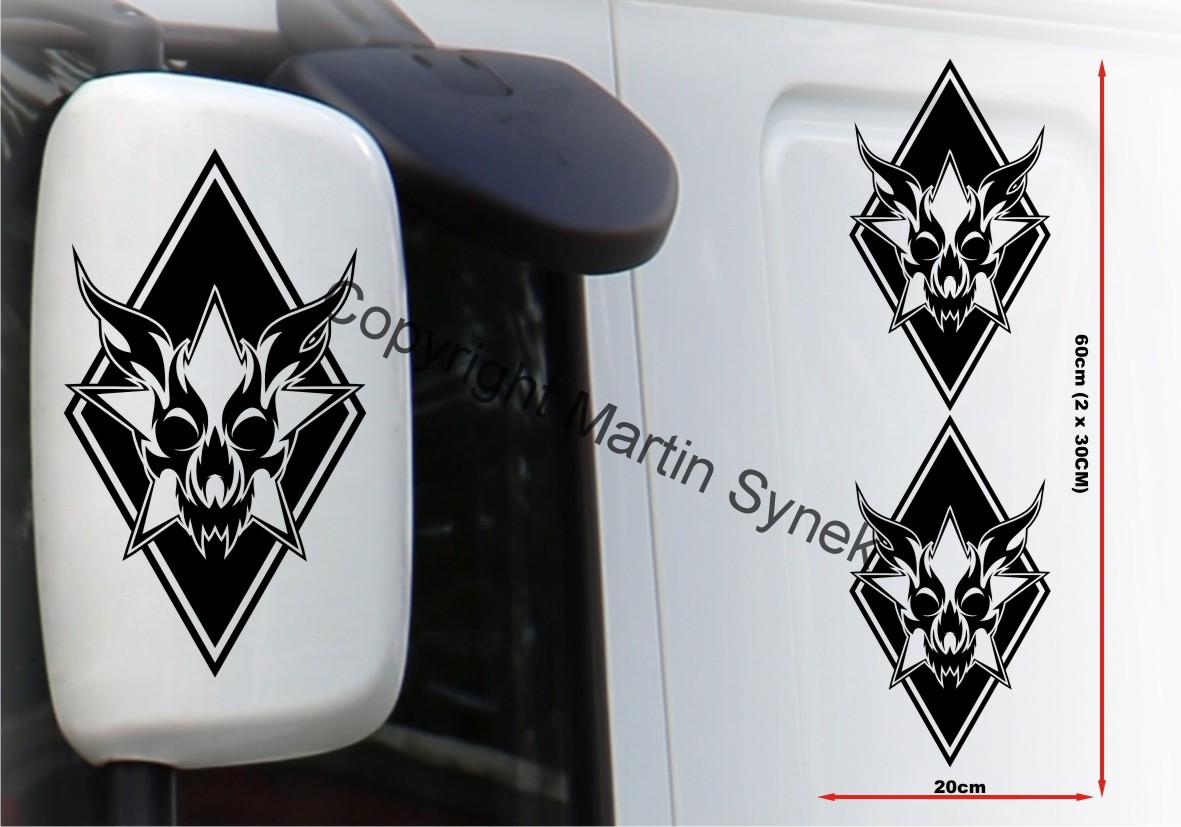Sada samolepek na deflektor či zrcátku, kabinu, kamkoliv. Sada obsahuje vždy dvě samolepky na levou a pravou stranu. Klasická, řezaná samolepka. To znamená, že když například vyberete modrou samolepku, bude motiv modrý a vše mimo motiv i vně motivu bude mít barvu podkladu kam samolepku lepíte.