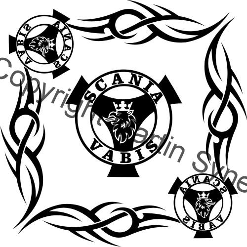 Ozdobná sada samolepek na obě okna kamionu. Klasická, řezaná samolepka. To znamená, že když například vyberete modrou samolepku, bude motiv modrý a vše mimo motiv i vně motivu bude mít barvu podkladu kam samolepku lepíte.