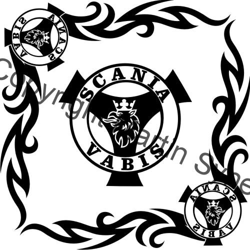 Ozdobná sada samolepek na obě okna kamionu. Klasická, řezaná samolepka. To znamená, že když například vyberete modrou samolepku, bude motiv modrý a vše mimo motiv i vně motivu bude mít barvu podkladu kam samolepku lepíte.