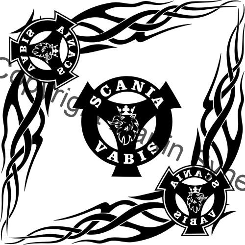 Ozdobná sada samolepek na obě okna kamionu. Klasická, řezaná samolepka. To znamená, že když například vyberete modrou samolepku, bude motiv modrý a vše mimo motiv i vně motivu bude mít barvu podkladu kam samolepku lepíte.
