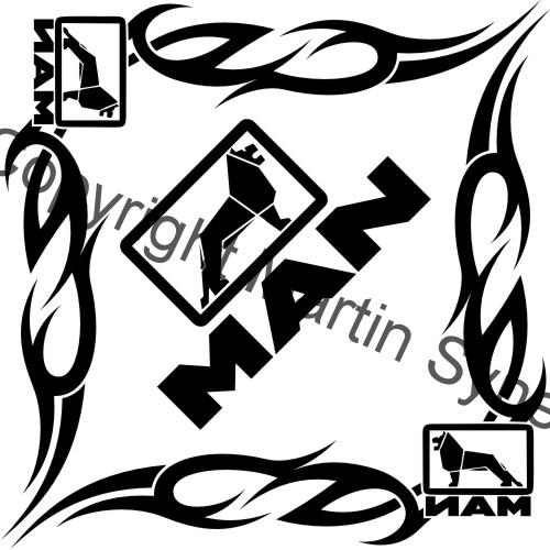 Ozdobná sada samolepek na obě okna kamionu. Klasická, řezaná samolepka. To znamená, že když například vyberete modrou samolepku, bude motiv modrý a vše mimo motiv i vně motivu bude mít barvu podkladu kam samolepku lepíte.