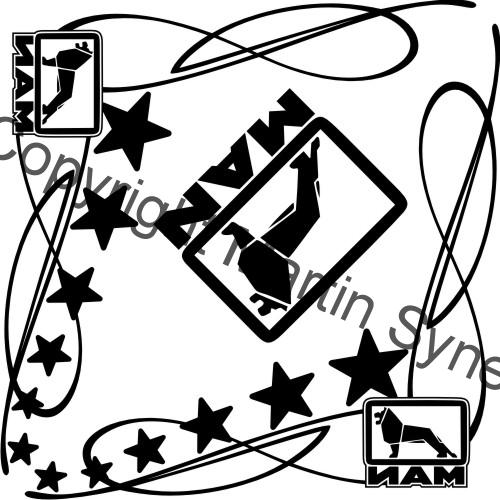 Ozdobná sada samolepek na obě okna kamionu. Klasická, řezaná samolepka. To znamená, že když například vyberete modrou samolepku, bude motiv modrý a vše mimo motiv i vně motivu bude mít barvu podkladu kam samolepku lepíte.