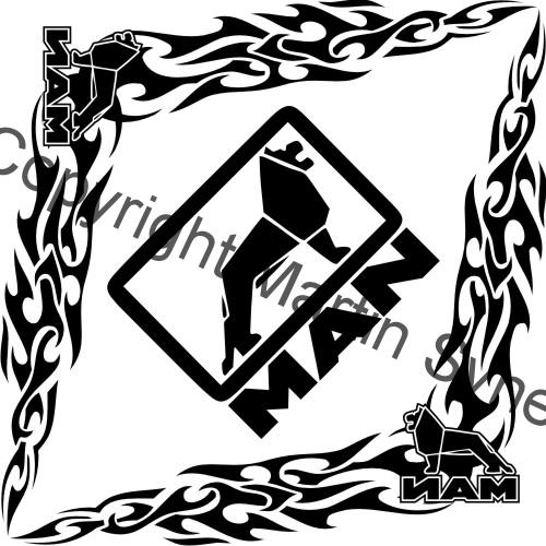 Ozdobná sada samolepek na obě okna kamionu. Klasická, řezaná samolepka. To znamená, že když například vyberete modrou samolepku, bude motiv modrý a vše mimo motiv i vně motivu bude mít barvu podkladu kam samolepku lepíte.