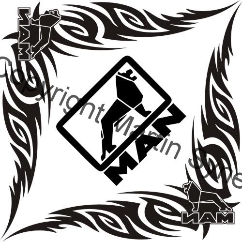 Ozdobná sada samolepek na obě okna kamionu. Klasická, řezaná samolepka. To znamená, že když například vyberete modrou samolepku, bude motiv modrý a vše mimo motiv i vně motivu bude mít barvu podkladu kam samolepku lepíte.