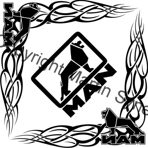 Ozdobná sada samolepek na obě okna kamionu. Klasická, řezaná samolepka. To znamená, že když například vyberete modrou samolepku, bude motiv modrý a vše mimo motiv i vně motivu bude mít barvu podkladu kam samolepku lepíte.