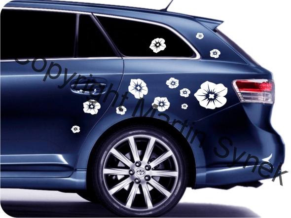 Sada dekoračních samolepek na auto. Samolepku můžete nalepit dle naši předlohy, nebo vlastní fantazie. Samolepka je určena na nalepení na bok, kapotu, okna nebo zadek vozidla. Je vyrobena z kvalitní folie Oracal. Dodáváme i s přenosnou folií pro snadné nalepení..