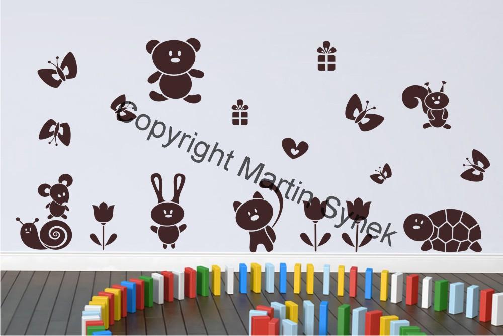 Samolepka na zeď složená z různých zvířátek. Vyrábíme tři velikosti setu. Orientační velikost želvy 17x10cm v setu 30x45cm