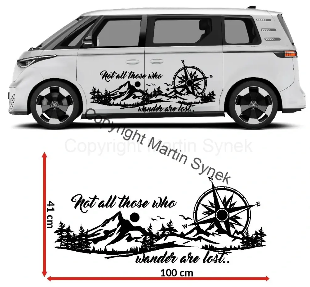 Samolepka na karavan, obytné auto, či obytnou dodávku. Vyrábíme ve všech rozměrech v jednom kuse do šířky maximálně 120cm. Větší rozměry lze vyrobit individuálně z více kusů. "Ne všichni kdo bloudí, jsou ztraceni.."
