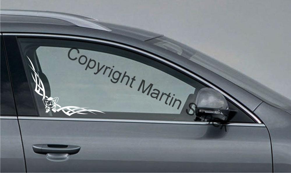 Samolepka na boční okna automobilu je skvělý a krásný doplněk. Skvěle doplňuje design Vašeho mazlíka.. Tento typ samolepky se hodí na téměř všechny novější i starší vozy s nepravoúhlým oknem. Škoda Fabia, Octavia, Superb, VVW Passat, Golf  a další a další.. V sadě jsou dodávány dvě samolepky na ... celý popis